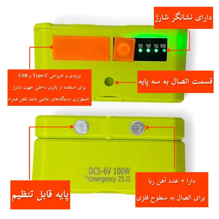 ☀️ شارژ خورشیدی + USB Type-C برای استفاده بدون محدودیت